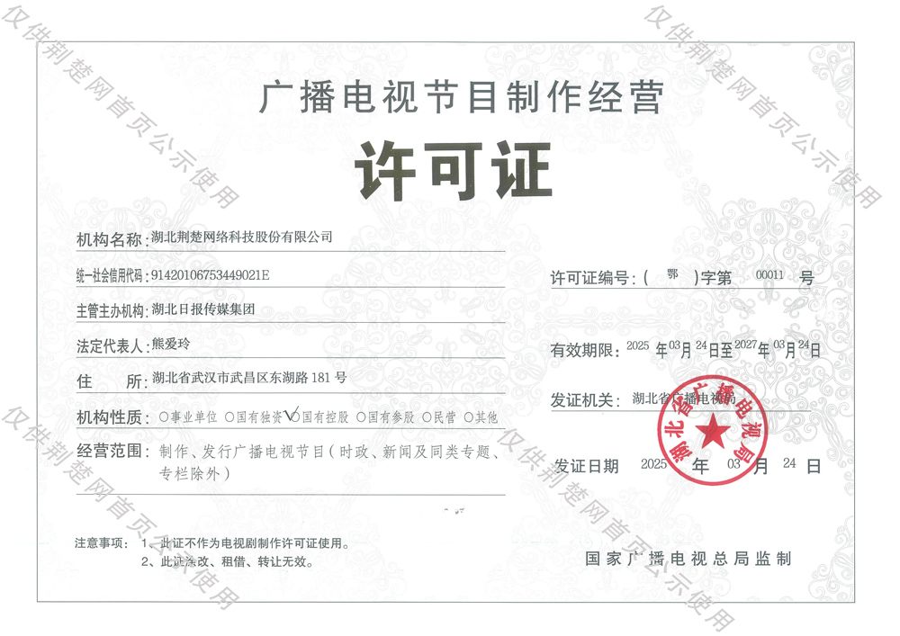 廣播電視節(jié)目制作經(jīng)營(yíng)許可證(鄂)字第00011號(hào)
