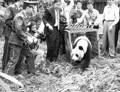 荊楚網(wǎng)消息(楚天都市報(bào))一只野生大熊貓日前闖入四川省都江堰鬧市(本報(bào)曾予報(bào)道),被當(dāng)?shù)亓謽I(yè)部門營救,并被送往臥龍自然保護(hù)區(qū)療養(yǎng)。8月8日,戴有GPS衛(wèi)星定位儀器的大熊貓被放歸都江堰龍溪虹口國家自然保護(hù)區(qū)。當(dāng)天,它沒說拜拜就踏出鐵籠走入密林,前后不到10秒鐘?蒲腥藛T在今后一年多的時(shí)間內(nèi),將對它進(jìn)行定位跟蹤,這有助于科學(xué)家進(jìn)一步了解和掌握大熊貓野外生活習(xí)性和活動規(guī)律。(新華社發(fā))