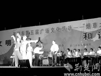 文化節(jié)期間,有2000多名專業(yè)或業(yè)余演員登臺(tái)亮相,演出節(jié)目160多個(gè);80多個(gè)單位派出演員,奉上自己精心編排的節(jié)目;蓮花落、碟子曲、三棒鼓、花鼓戲、天門漁鼓等群眾喜聞樂見的民間文藝,紛紛被搬上廣場舞臺(tái),6萬多人次觀賞了廣場文藝演出。