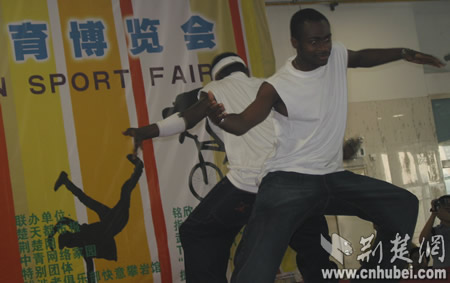 在進行完跆拳道、極限單車秀等展演后,下午3時,博覽會進入最后一個表演環(huán)節(jié)。由兩名黑人hiphop高手Joel、姆巴帶來的風味獨特的街舞表演,將現(xiàn)場氛圍帶到了最高點。而武漢本地的三個街球團隊SBA武漢、313、NO.1與國內(nèi)街球高手嘉賓吳悠、崔闖、KK、劉堅共同上演了一場絕妙的Freestyle表演,引來觀眾的陣陣歡呼,他們精彩的表演,也為此次博覽會畫下了完美的句號。
