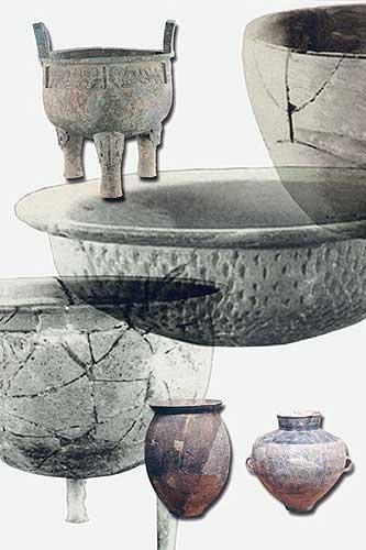 仰韶文化陶鼎;炊器(下左,高27.5厘術(shù))