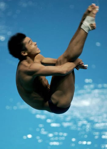 2005年10月5日,十運會跳水決賽最后一天的比賽在南京奧體中心落幕。在男子單人1米板的決賽中,預賽中排名第一位的廣東新秀何沖一掃在3米板比賽中沖金失利的陰影,憑借最后兩跳近乎完美的表現(xiàn)以總成績500.01分獲得冠軍。上海老將王天凌則以490.32分獲得銀牌,另外一名廣東選手羅玉通以466.53分摘得銅牌。解放軍名將彭勃和代表山東參賽的衛(wèi)冕冠軍王峰則因為在比賽中出現(xiàn)重大失誤,分別以447.12分和435.66分名列第五和第八位。圖為何沖在比賽中。(中體在線圖片 李錦河 攝)