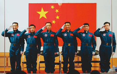 昨日,6位中國航天員在酒泉衛(wèi)星發(fā)射中心航天員公寓———問天閣的一個大廳內(nèi)集體亮相。由左至右是:翟志剛、吳杰、費(fèi)俊龍、聶海勝、劉伯明、景海鵬。新華社記者趙建偉攝