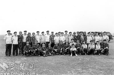 我國首批宇航員在駐鄂空降兵某部圓滿完成傘訓任務(wù)后,與部分傘訓保障人員合影。前排左二為聶海勝,后排右六為費俊龍,后排左六為楊利偉。