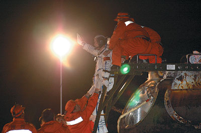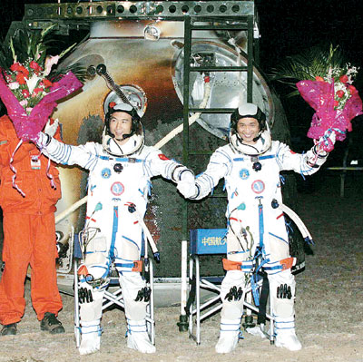 費(fèi)俊龍、聶海勝隔著舷窗,在向人們招手———返回艙內(nèi)柔和的燈光,映著他們的微笑。這一刻,距他們離開大地4天又19個多小時,他們的總行程為325萬余公里。