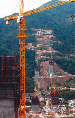 龍?zhí)逗犹卮髽蚓o鄰長陽縣榔坪鎮(zhèn),是滬蓉西高速公路上一座T構(gòu)箱梁橋,主橋墩最高178米,居世界同類橋高墩之最。“見過這么高的塔吊沒?”戴上安全帽,湖北路橋公司項目經(jīng)理夏君華帶記者一行踏訪工地。