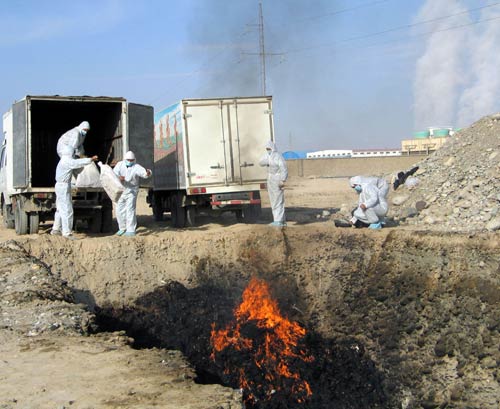 工作人員在新疆澤普縣奎依巴格鎮(zhèn)焚燒被撲殺的家禽(11月13日攝)