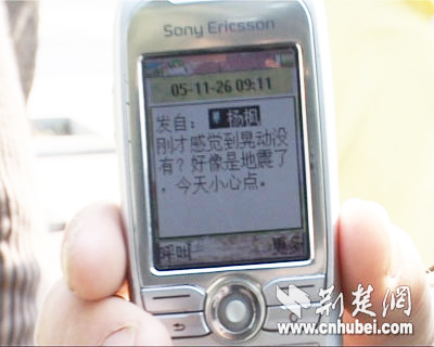 用戶:ymcbz 今天上午8時(shí)45分左右,我們還以為起了大風(fēng)……有的人已經(jīng)跑到樓下:是不是有地震? 五樓的小涂說(shuō):太陽(yáng)能水管在擺動(dòng)……前樓的小王說(shuō):窗簾斜擺,風(fēng)鈴發(fā)聲! 家里魚缸的水晃出來(lái)了! 縣檢察院正在開會(huì),桌上的茶杯晃動(dòng),大家都往樓下跑。 感謝荊楚網(wǎng),快速告訴了我們事實(shí)的真相!