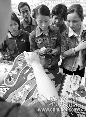 荊楚網(wǎng)(湖北日報)(記者 王威 通訊員 王奇 攝)20日,參加全省農(nóng)民工職業(yè)技能鑒定工作會議的各地代表,在孝感市人民廣場擺開擂臺,展示他們選送的出自于農(nóng)民工之手的各種絕技絕活,并向農(nóng)民工贈送價值百萬元的技能鑒定圖書。這是我省首次舉辦農(nóng)民工技能鑒定成果展,從精美的竹器到精致的鋼模具,從精細電子產(chǎn)品到鄉(xiāng)土氣息濃郁的刺繡鞋墊,上百種展品不僅引起了市民的濃厚興趣,也反映出農(nóng)民正由靠勤勞致富向靠知識技能致富轉(zhuǎn)變。記者從會上獲悉,截至8月底,我省已組織農(nóng)民工職業(yè)技能鑒定26.8萬人次,預(yù)計全年可實現(xiàn)40萬人次,到“十一五”期末,全省技能勞動者占社會從業(yè)人員的比重將達到50%。