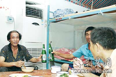 記者走進(jìn)一間宿舍,頓時感受到了空調(diào)吹出的絲絲涼氣,顯示溫度為26℃。工人們正在喝啤酒吃晚餐,因為涼快,沒有一個打赤膊的。大伙笑著說:往年一到夏天總為睡覺發(fā)愁,太熱了睡不好,白天做事自然沒精神,今年用上空調(diào)后,日夜心里都蠻爽。