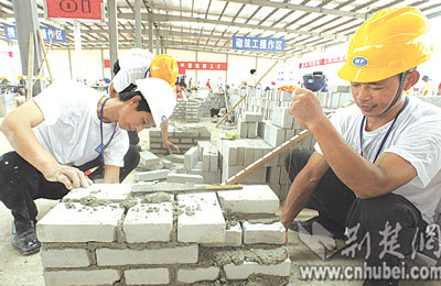 昨日,前往湖北城市建設(shè)職業(yè)技術(shù)學(xué)院藏龍島校區(qū)參賽的,除了精細(xì)木工外,還有砌筑工、鋼筋工和鑲貼工等工種,共114名選手。他們是從全省117萬建筑工人中層層選拔出來的。