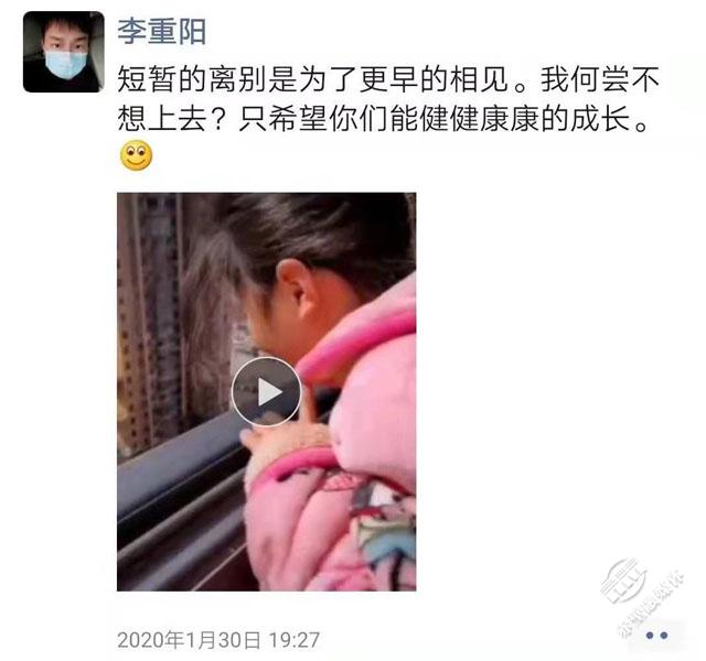 李重陽是中心消殺隊(duì)伍中的一員,1月29日,正值大年初五,已經(jīng)近10天沒回家的他接到了到自己所住小區(qū)開展消殺工作的任務(wù)。所有工作完成后,他只能在樓下?lián)芡ㄒ曨l,遠(yuǎn)遠(yuǎn)的看了一眼妻子,聽著兒女叫了一聲“爸爸”。當(dāng)天,李重陽發(fā)了這樣一條朋友圈:“短暫的離別是為了更早的相見。我何嘗不想上去?只希望你們能健健康康的成長?!崩钪仃栔皇浅啾诩部乇姸嗄贻p消殺隊(duì)員的一個(gè)代表。很多人無聊的“家”,正是他們一線疫情防控人員想回卻回不去的“家”。