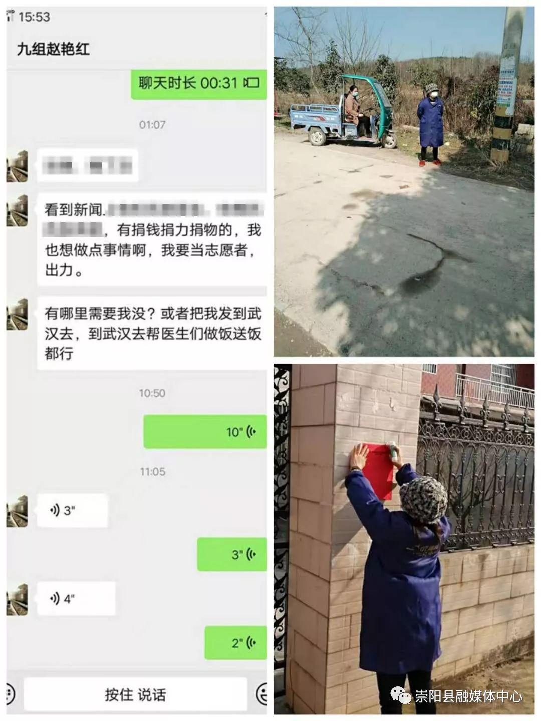 “有哪里需要我嗎?我要當志愿者,哪怕是到武漢去為醫(yī)生做飯送飯都行?!边@是青山鎮(zhèn)城萬村九組村民趙艷紅2月2日凌晨1點,向村婦聯(lián)主席發(fā)出的“請戰(zhàn)”信息。