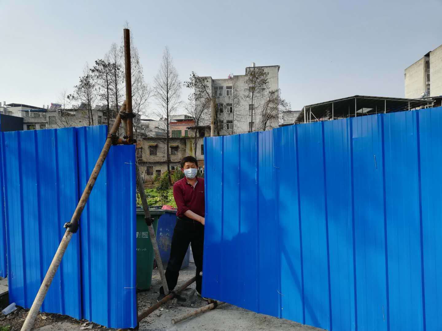 自臘月二十九日開始,村干部們帶頭上,購買了樹木、鐵皮,立樹樁,釘鐵皮墻。大道兩邊相向設置,從南門河四橋開始,一直到城內小區(qū)。到大年三十晚上,兩道藍色的“屏障”悄悄立起,它們“環(huán)著村、環(huán)著城”,成為斬斷疫魔的“致命一招”。