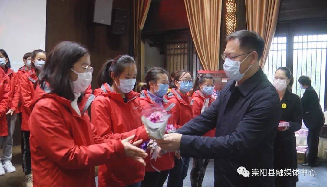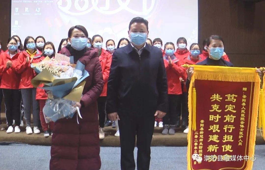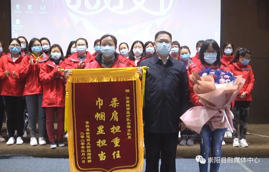 活動(dòng)中,縣委副書(shū)記、縣長(zhǎng)鄭俊華向云南援崇醫(yī)療隊(duì)贈(zèng)授“柔肩擔(dān)重任·巾幗顯擔(dān)當(dāng)”感謝錦旗,縣委副書(shū)記、縣委政法委書(shū)記程冰野為崇陽(yáng)縣人民醫(yī)院授予“巾幗建功集體”榮譽(yù)錦旗,同時(shí),向每一位云南援崇醫(yī)療隊(duì)女醫(yī)護(hù)人員和奮戰(zhàn)在戰(zhàn)“疫”最前線的女醫(yī)生、女護(hù)士代表送上了鮮花和節(jié)日禮物。