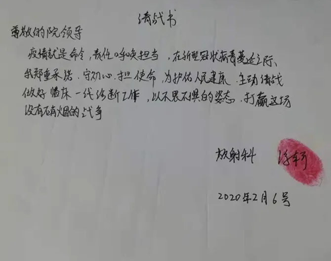 在疫情最緊急的時候,全院200多位醫(yī)護(hù)人員主動請纓加入“戰(zhàn)斗”,一筆筆簽名,一個個紅手印,彰顯的是責(zé)任,是面對疫情時絕不退縮的堅強(qiáng)擔(dān)當(dāng)!