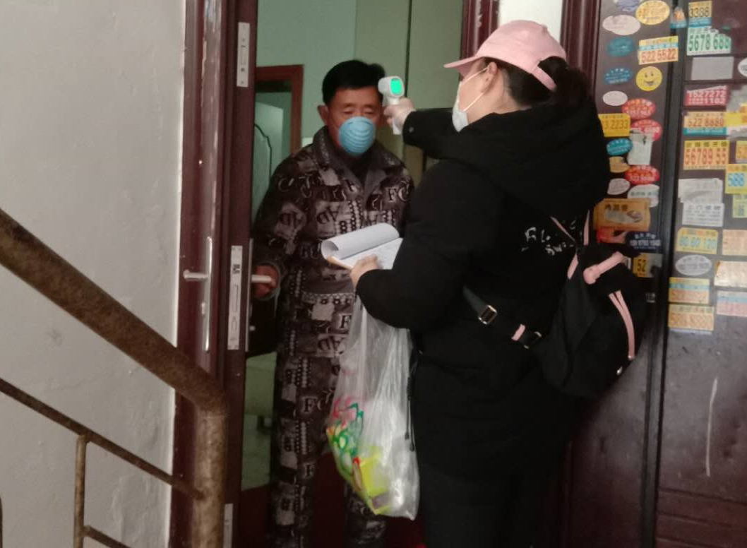 ▲為小區(qū)居民測體溫