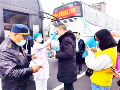 檢查身份信息、核驗健康綠碼、監(jiān)測體溫、消毒……在現(xiàn)場工作人員的組織下,所有返崗復(fù)工人員有序上車。