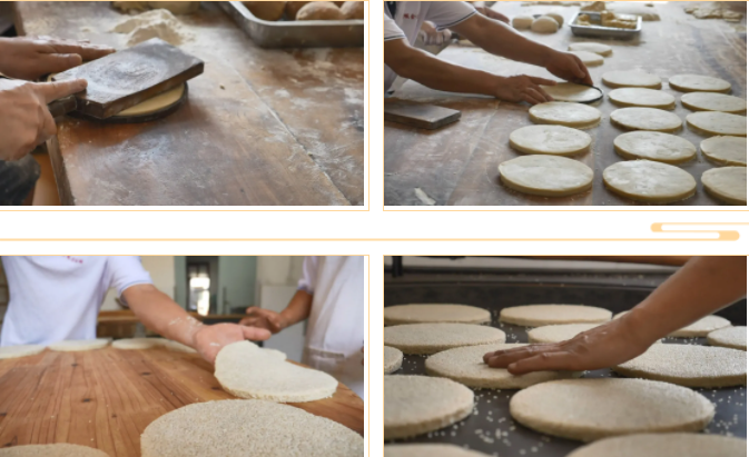 做好一批麻餅坯子,灑上些許面粉,搬移到竹匾中,在這里進(jìn)行兩面著麻的工序,幾個(gè)來(lái)回?fù)u移翻面間,芝麻均勻附著在面餅上,煞是好看了。