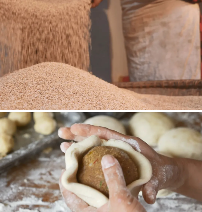 麻餅在制作前,先要炒好芝麻,炒好的芝麻倒進(jìn)竹匾,其香味隔著鏡頭似乎都能聞得到。用各色干果仁、加上冰糖、陳皮、金錢桔等,十幾種食料破碎攪拌而成的餡料被搓好了,面團(tuán)也被分成適量的面劑,再將搓好的餡料包進(jìn)去,在鐵箍模具中,用木柄敲打延展和切削定型。