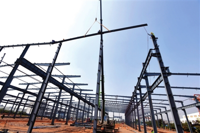 10月13日,咸安經濟開發(fā)區(qū)華寧防腐科技產業(yè)園二期項目,工人們正在吊裝鋼架廠房。