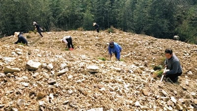 2月17日(大年初六)上午,春風(fēng)輕拂,暖陽(yáng)高照,年味正濃,在青山疊翠的汀泗橋鎮(zhèn)古田村十四組背底窩的一個(gè)小山坡上,傳來(lái)一片歡笑聲和鋤地聲,40余名村民正在忙著栽種杉樹(shù)苗。