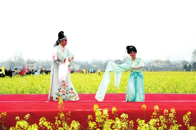 精彩的文藝演出、極具地方風(fēng)情的民俗表演和國家非物質(zhì)文化遺產(chǎn)提琴戲演唱,與花海交相輝映,為大家?guī)砹艘暵犑⒀?。開幕后,游客開始游玩賞景,大家邊感嘆七彩油菜花的美,邊呼朋引伴拍照留念,人花相映襯,美不勝收。除了賞花,大家還紛紛品嘗特色美食,購買當(dāng)?shù)靥厣r(nóng)產(chǎn)品。