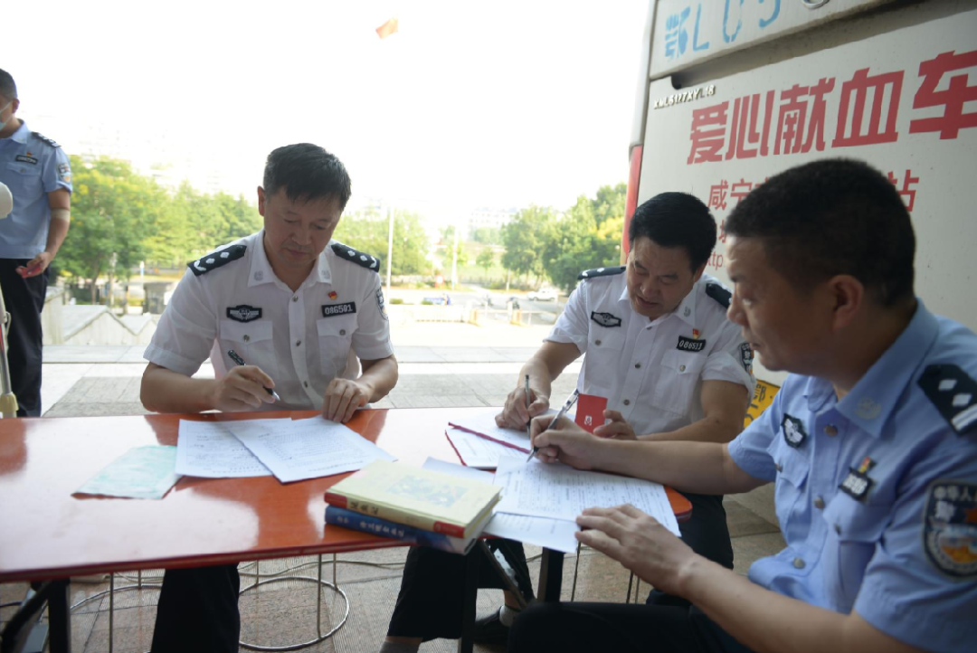 在咸寧公安主樓門廊中,聞訊趕來的民輔警整齊列隊,按照醫(yī)務人員的指引,依次進行信息登記、血液檢查、靜脈采血。有多次參加獻血的“金獎老將”,也有初次上陣的“警營新兵”,還有尚在見習期的“學警新秀”。心照不宣的接力,在新老交織中流淌、賡續(xù)、傳承,匯聚起愛的暖流!