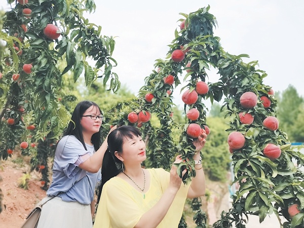 6月8日,游客在丹江口市均縣鎮(zhèn)均州蜜桃采摘園采摘蜜桃。眼下,正值蜜桃成熟期,該園吸引了不少游客前來采摘。據(jù)了解,2019年4月,原鄉(xiāng)人張慶華投資400多萬元成立丹江口市億園果樹種植專業(yè)合作社,在當?shù)亓鬓D(zhuǎn)200余畝荒地種植蜜桃,今年可采摘蜜桃25萬公斤,收入200余萬元,帶動70余名農(nóng)戶平均增收6000元。記者李平攝
