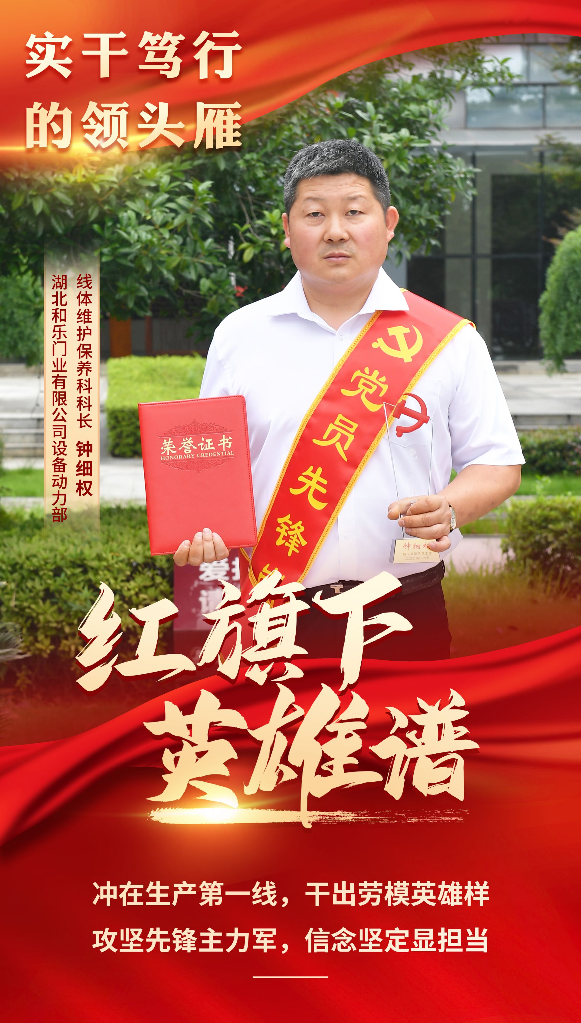 為進(jìn)一步發(fā)揮黨支部戰(zhàn)斗堡壘和黨員先鋒模范作用,咸寧高新區(qū)黨工委研究決定,授予鐘細(xì)權(quán)等10名同志“黨員先鋒崗”榮譽(yù)稱號。