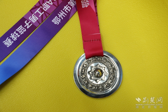 記者在現(xiàn)場看到,已制成的冠軍銅鏡獎牌整體為銀白色,花紋繁復精美?!跋裎覀兇舜伪荣惇勁扑玫你~鏡叫做日光鏡,也是透光鏡,當強光照射在鏡面時,鏡背的花紋會映照在鏡面對面的墻上。”仙有生拿出手電筒現(xiàn)場演示,展現(xiàn)了令人驚奇的一幕——“鄂州市第二屆‘工BA’ 冠軍”的字樣躍然墻上。