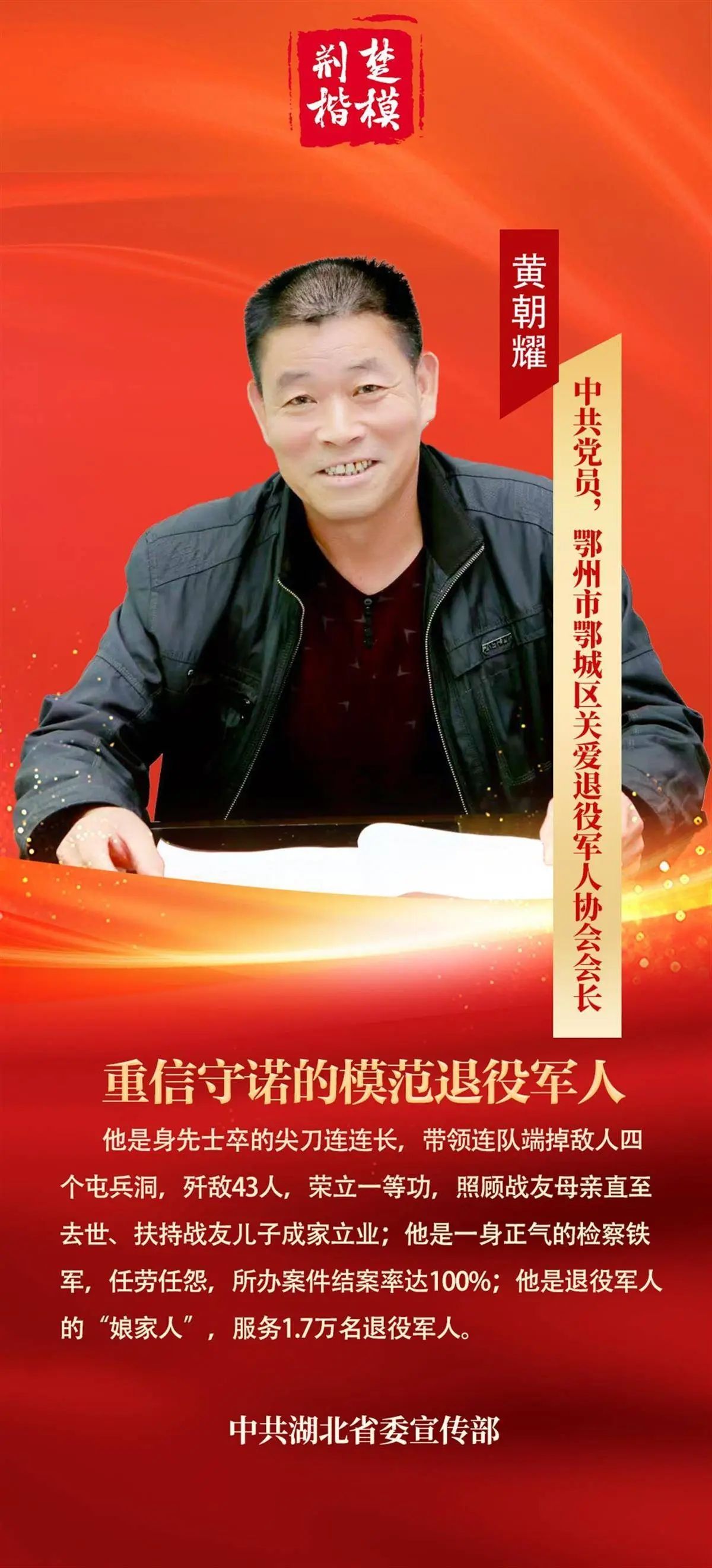 “荊楚楷模”關(guān)于黃朝耀的頒獎詞為:他是身先士卒的尖刀連連長,帶領(lǐng)連隊端掉敵人四個屯兵洞,殲敵43人,榮立一等功,照顧戰(zhàn)友母親直至去世、扶持戰(zhàn)友兒子成家立業(yè);他是一身正氣的檢察鐵軍,任勞任怨,所辦案件結(jié)案率達(dá)100%;他是退役軍人的“娘家人”,服務(wù)1.7萬名退役軍人。2024年,他榮獲“全國模范退役軍人”榮譽(yù)稱號。