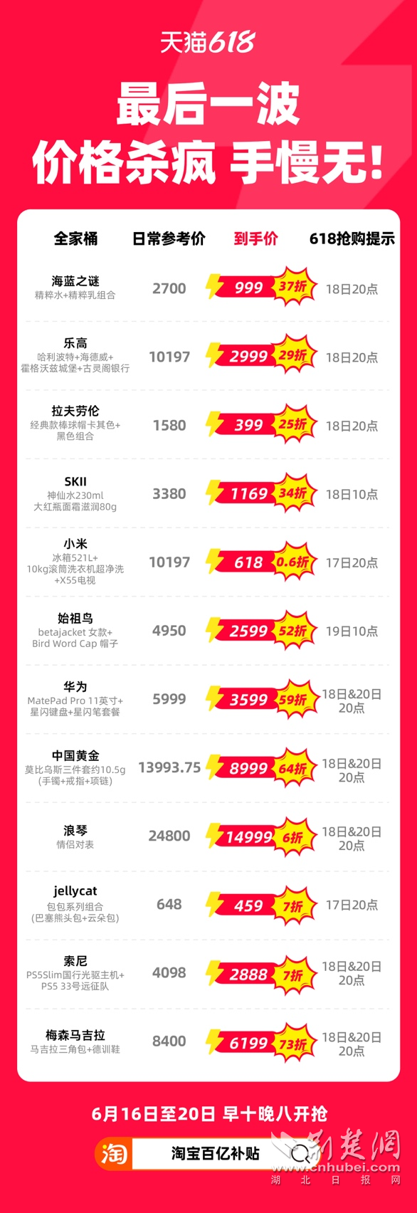 荊楚網(wǎng)(湖北日?qǐng)?bào)網(wǎng))訊(通訊員 朱飛)6月16日至6月20日,天貓618迎來最后一波瘋狂加碼。在官方立減85折基礎(chǔ)上,諸多權(quán)益都有不同程度的升級(jí)。