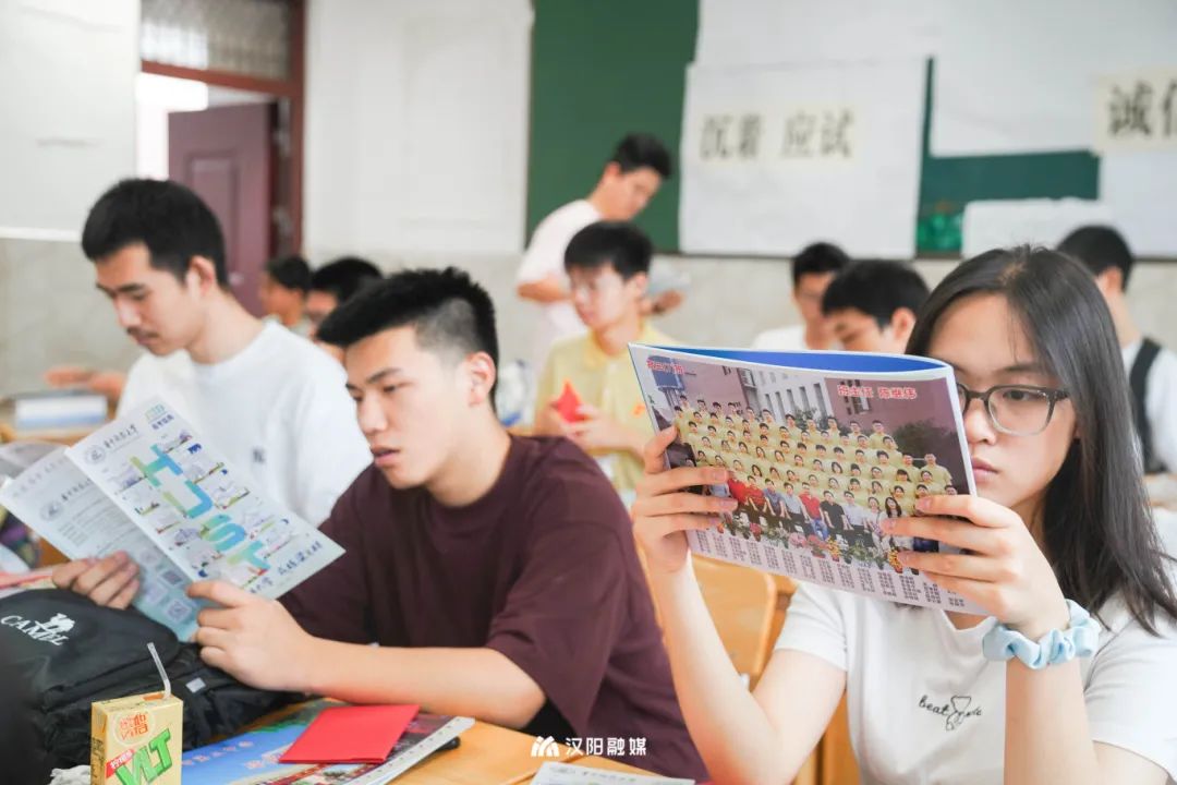 △高考查分第二天,高三(12)班的同學(xué)們返校,此時(shí)的他們心情輕松。