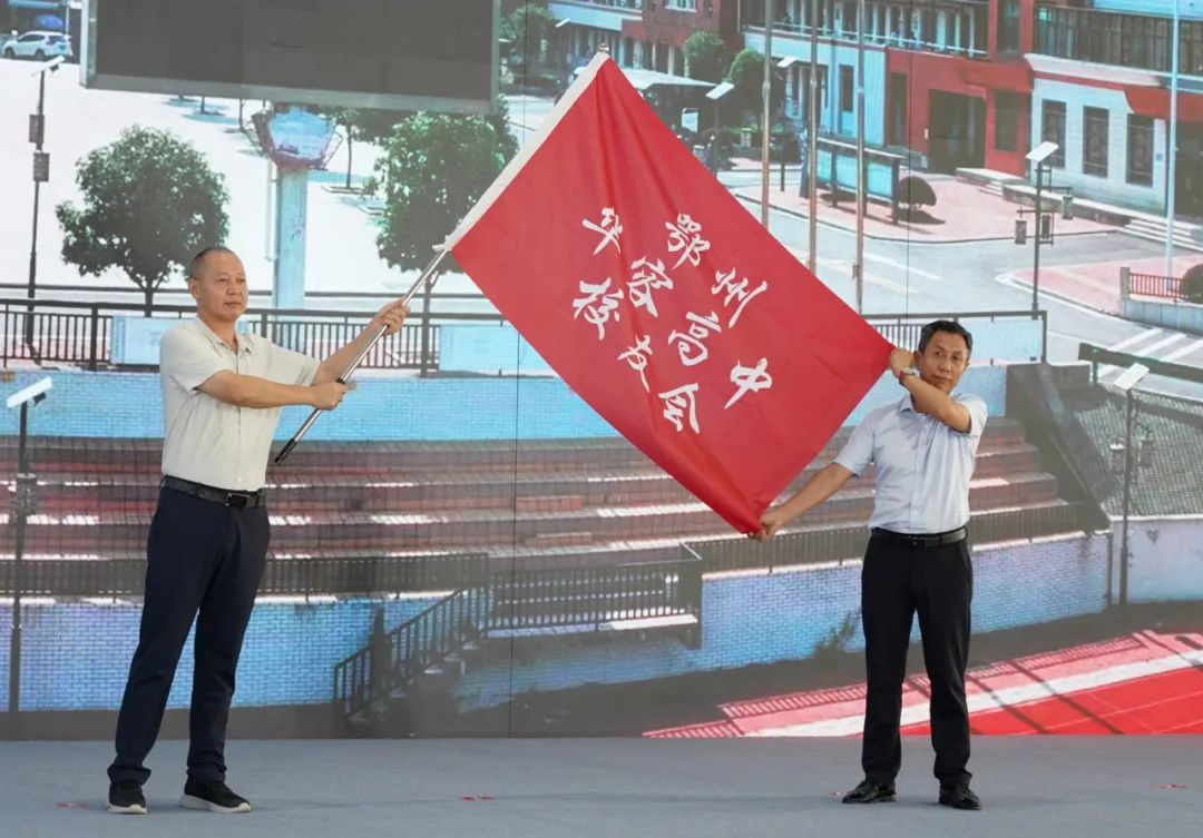 華容高中校長姜勝飛向校友代表授旗