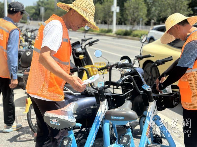 荊楚網(wǎng)(湖北日?qǐng)?bào)網(wǎng))訊( 通訊員 韓時(shí)珺)7月30日上午10時(shí),武漢東湖高新區(qū)關(guān)東街道熱浪翻涌。十余名身著橘色工裝的環(huán)衛(wèi)工人,正細(xì)致地清理著共享單車(chē)車(chē)身上的“牛皮癬”——那些惱人的小廣告。他們手中的鏟刀與抹布上下翻飛,清除污漬的同時(shí),也順手將路邊的共享單車(chē)一一擺放齊整。汗水浸透衣衫,卻無(wú)人停歇。