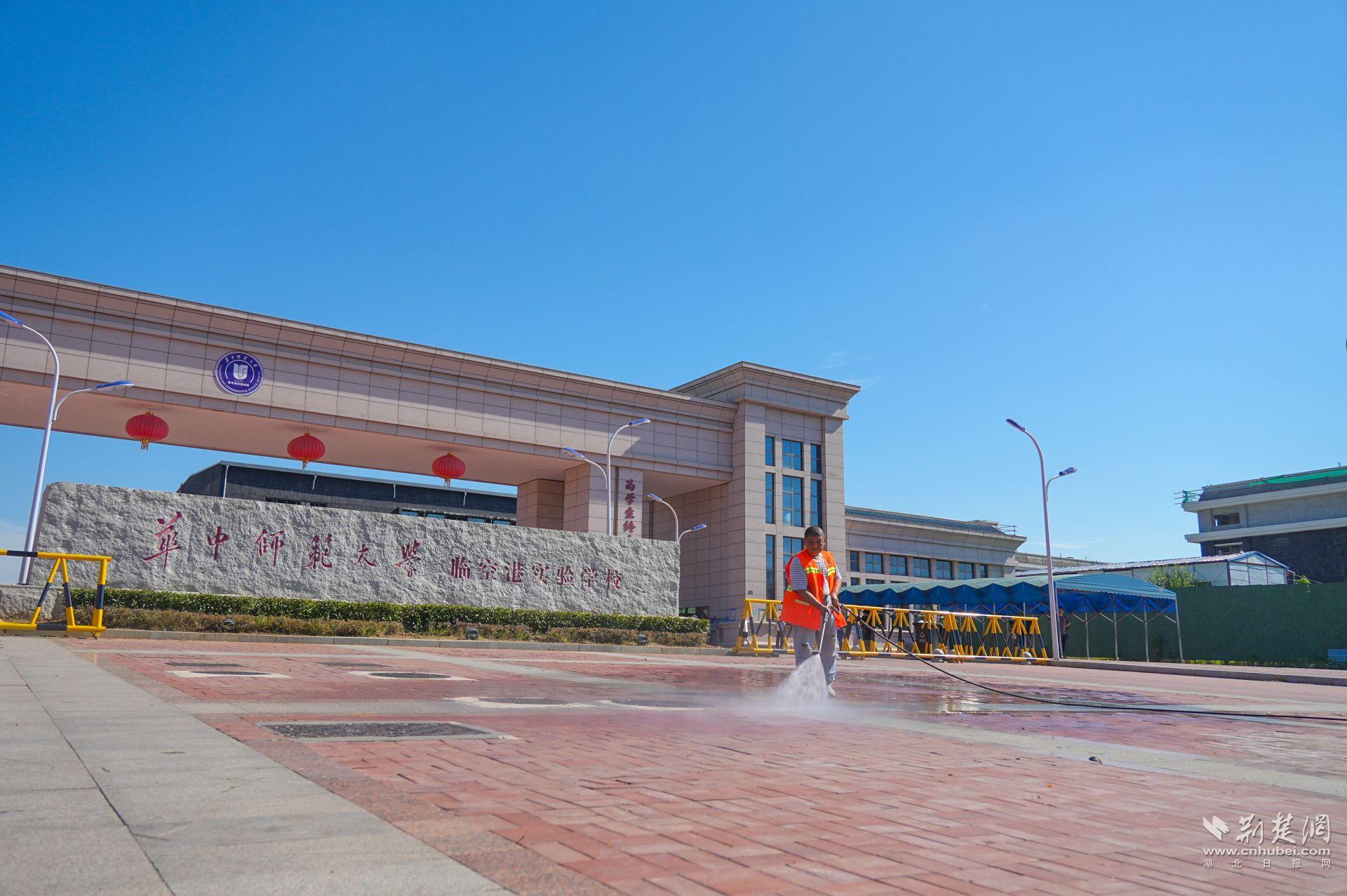 校園周邊環(huán)境的整潔同樣關(guān)系到孩子們的安全與健康。8月29日清晨,在華中師范大學(xué)臨空港實驗學(xué)校門口,7名環(huán)衛(wèi)工人配合一輛高壓沖洗車,正對人行道、護欄、公交站臺進行細致清潔,地磚縫隙間的落葉、油漬也不放過。