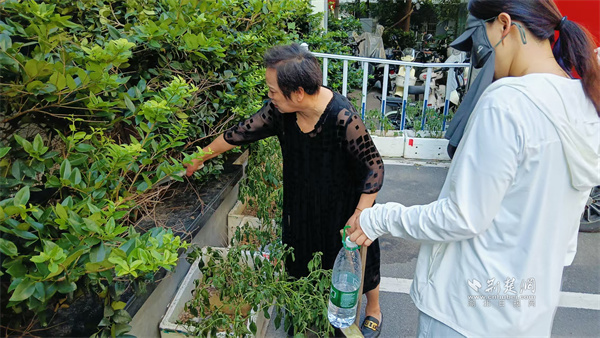 彭劉楊路社區(qū)網(wǎng)格員帶領居民清理積水容器。 通訊員供圖