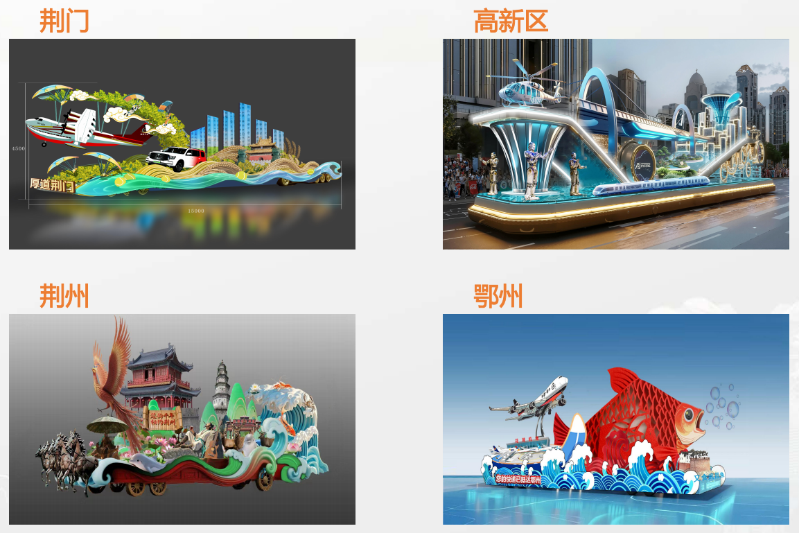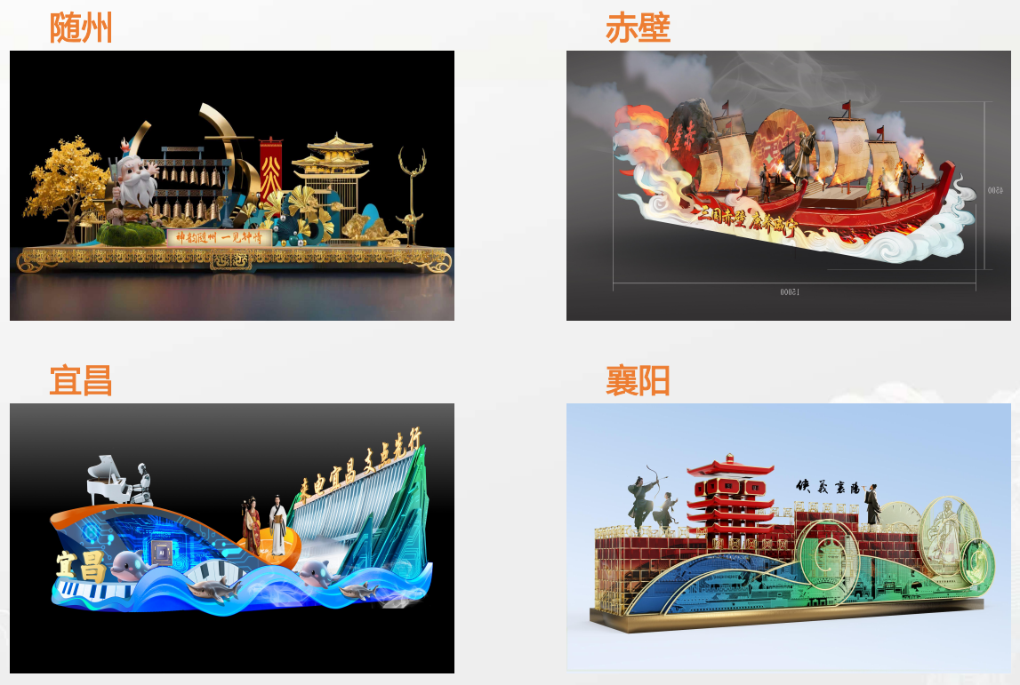 6臺主題花車,分別為“河山錦繡”“初心如磐”“楚風漢韻”“非遺國潮”“動漫萌寵”“全球狂歡”;14臺品牌花車,涵蓋湖北省多個市州及地區(qū)。