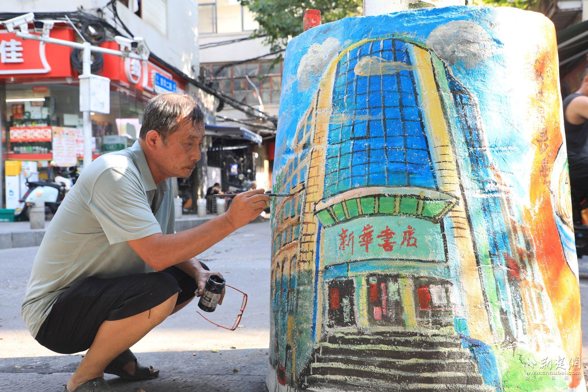 畢業(yè)于湖北美院雕塑專業(yè)的易小陽,年輕時就愛畫速寫。退休后,他決定把老街巷當畫布。半年時間,他義務繪制了120多處墻繪,總面積近500平方米。