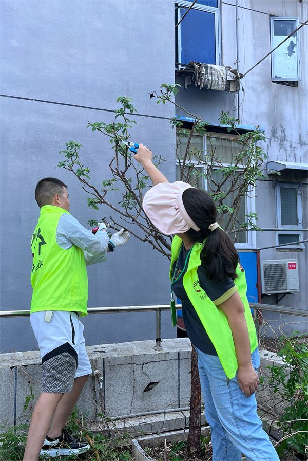 紅衛(wèi)路街道才聚社區(qū)園藝師肖福英修剪凌霄花枝條。 通訊員供圖