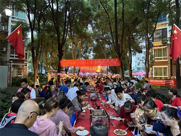 活動中,文藝表演與互動環(huán)節(jié)穿插進行,帥鼓《歌唱祖國》、民樂《地道戰(zhàn)》、黃梅戲《再唱山歌給黨聽》輪番上演。當54平方米的巨幅國旗緩緩展開,居民們揮舞小國旗齊唱贊歌,手中的紙飛機帶著美好祝愿飛向夜空,電子煙花綻放的瞬間,現(xiàn)場氣氛達到高潮。此外,三輪抽獎、“最受歡迎菜品”評選等環(huán)節(jié),更讓活動充滿驚喜與趣味。
