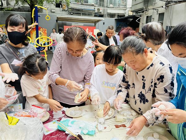 活動現場,各區(qū)域精彩紛呈?!扒墒肿鲈嘛灐弊钍菬狒[,家庭成員圍在桌前,揉面、包餡、壓模默契配合,一個個晶瑩的冰皮月餅新鮮出爐;銀杏樹上掛著百余條燈謎,“舉頭望明月(打一中藥名)”“中秋菊盛開(打一成語)”引得居民駐足思索,不時有人喊出答案,歡呼聲此起彼伏。小朋友們也有專屬樂趣,“月滿花環(huán)”區(qū)里,用仿真花材編出中秋裝飾;“玉兔拔蘿卜”游戲中,你追我趕比拼速度,歡笑聲此起彼伏。