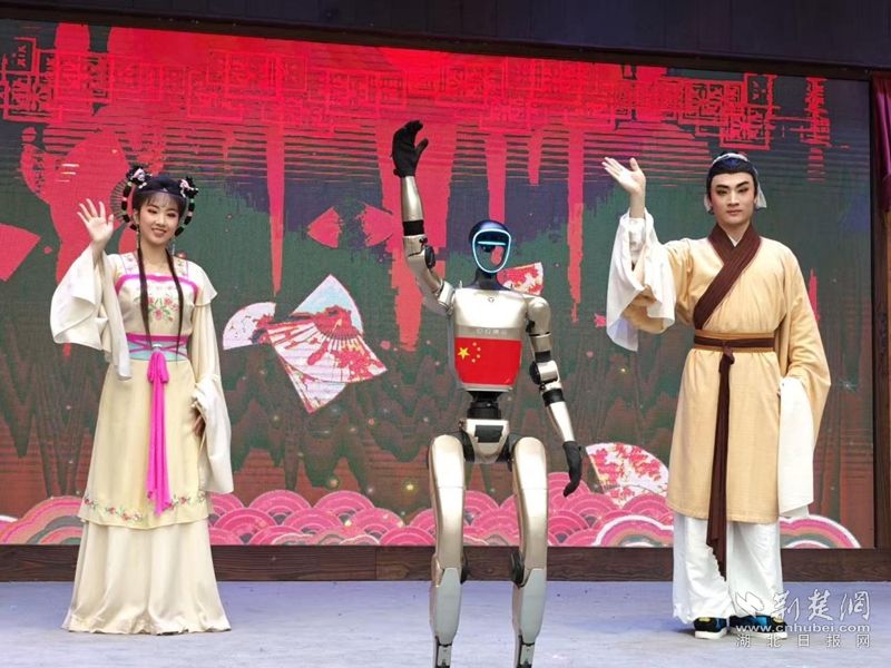 荊楚網(wǎng)(湖北日報網(wǎng))訊(通訊員王晶、費留燦)國慶中秋假期,在黃梅縣東山問梅村,當黃梅戲《女駙馬》的經(jīng)典唱段響起,機器人踩著婉轉(zhuǎn)唱腔靈活擺臂、轉(zhuǎn)身,復刻戲曲身段的韻味;戲腔未落,身著傳統(tǒng)獅頭裝扮的機器狗躍至臺前,跟著鼓點騰躍撲閃,鬃毛翻飛間盡顯靈動,引得游客紛紛舉手機拍攝,鏡頭緊追這些“特殊演員”。