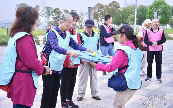 活動現(xiàn)場設(shè)置了三個(gè)互動游戲區(qū)域,“不倒森林”游戲中,老人們圍成一圈,默契配合轉(zhuǎn)動長桿;“四平八穩(wěn)”環(huán)節(jié),大家小心翼翼地操控游戲道具,努力保持小球平衡;“同舟共濟(jì)”時(shí),三人一組相擁站在墊子上協(xié)同挪動。這些趣味拓展活動不僅鍛煉了老人們的協(xié)調(diào)能力,更在歡聲笑語中增進(jìn)了鄰里情誼。