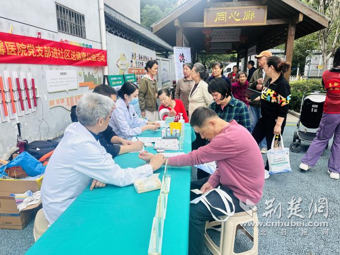 在另一角落,醫(yī)護(hù)人員耐心講解健康知識,社??ㄞk理區(qū)的漢口銀行工作人員忙個(gè)不停,為居民免費(fèi)辦理社??ㄉ墭I(yè)務(wù)。