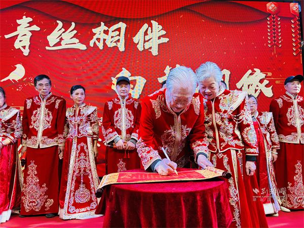 隨著輕柔音樂響起,身著中式禮服的夫婦們手挽手踏上紅毯。歲月雖在臉龐刻下痕跡,卻擋不住眼中對彼此的溫柔。他們共同執(zhí)筆書寫婚書,一撇一捺間重溫“執(zhí)子之手”的初心;交杯共飲合巹酒,延續(xù)“同甘共苦”的承諾;交換黑檀朱砂掛件,“你一半我一半”的信物成了彼此最深的牽絆。在婚姻登記處頒證員的見證下,夫婦們接過“結(jié)婚紀(jì)念證書”與鮮花,現(xiàn)場掌聲、祝福聲此起彼伏。