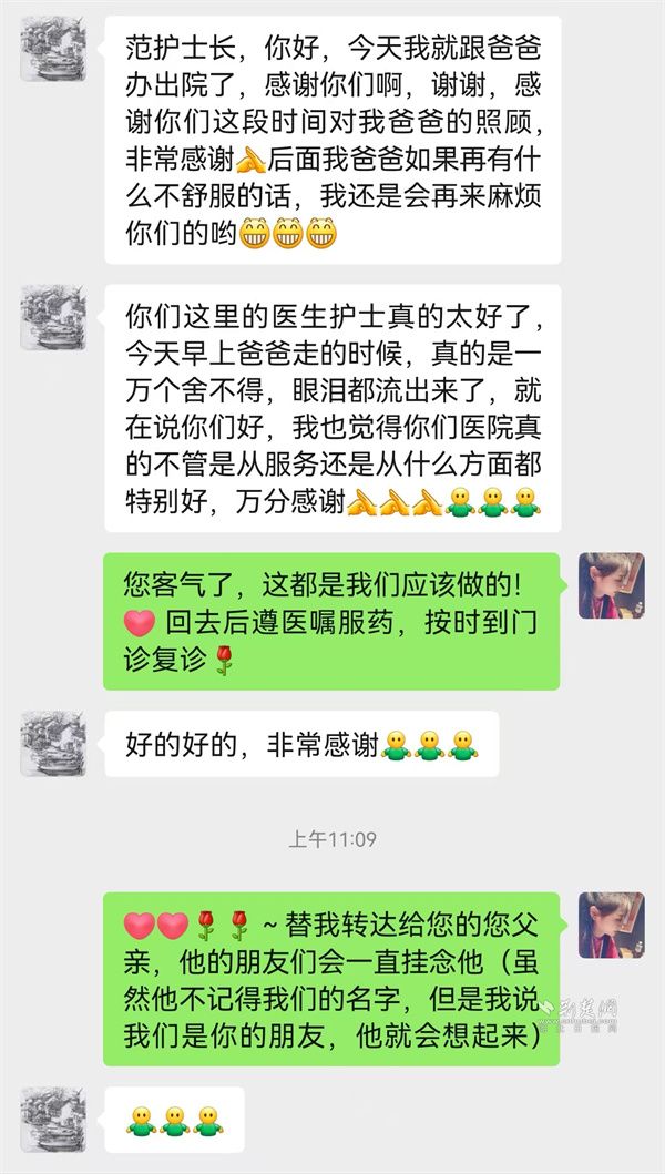 這份細(xì)致關(guān)懷,也深深印在患者和家屬心里。患者蔡爹爹出院前,女兒特意給副護(hù)士長范美玲發(fā)來微信:“你們這里的醫(yī)生護(hù)士真是太好了,爸爸在這住得比家里還舒心,你們比親人還細(xì)心。今天早上離開的時候,他一萬個舍不得,反復(fù)念叨著不想走?!?/p>