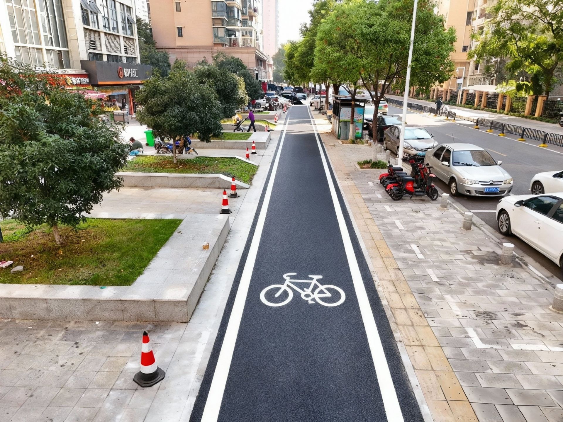路面平整之后,還劃上了清晰的非機(jī)動車道標(biāo)線,人車分流,騎行、步行互不干擾。同時(shí),為了防止機(jī)動車占道,沿線還加設(shè)了8處阻車樁,機(jī)動車再也不能“霸占”人行道了。