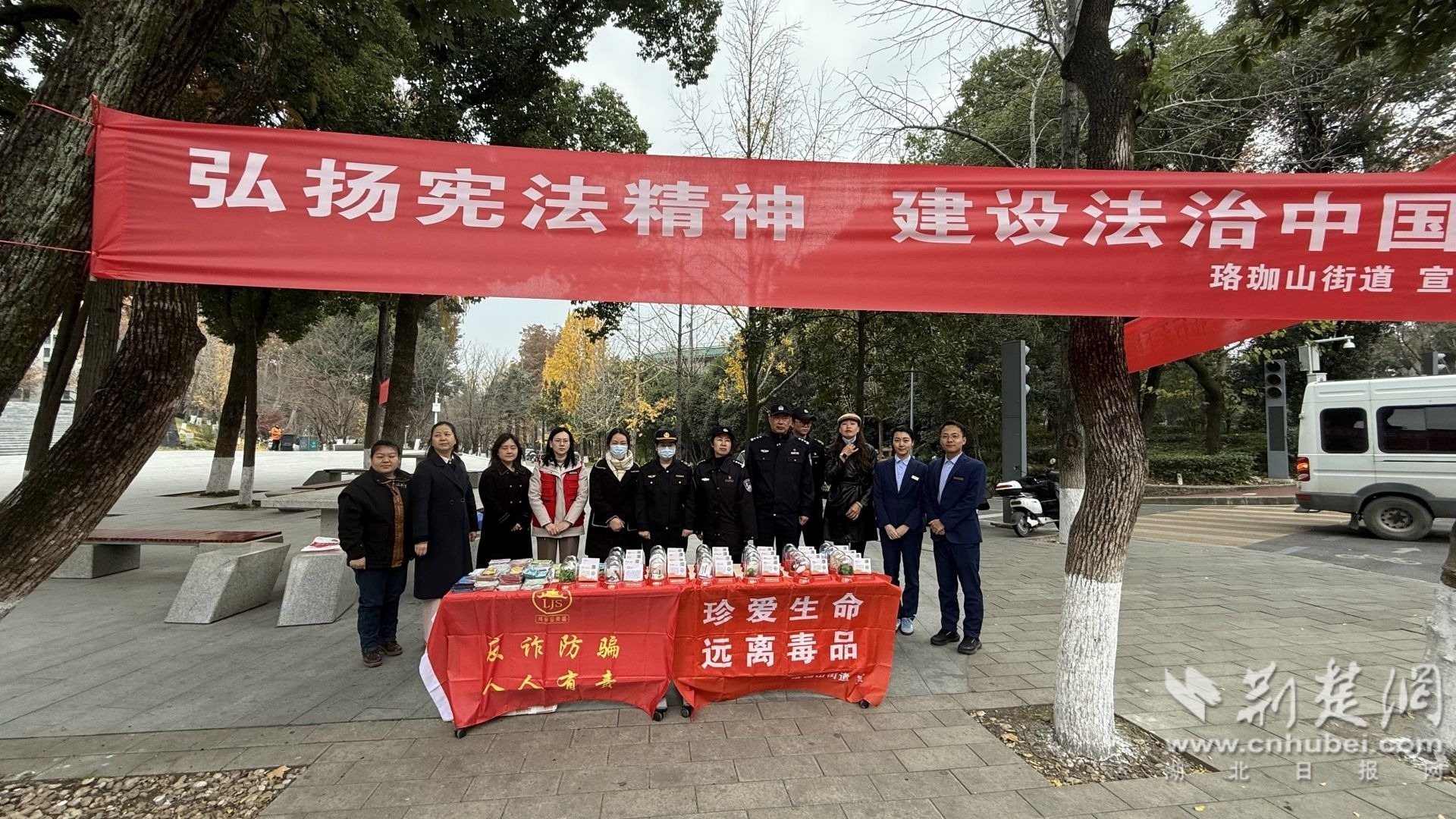 荊楚網(wǎng)(湖北日報(bào)網(wǎng))訊(通訊員 方茜)12月4日,武昌區(qū)珞珈山街道聯(lián)合武漢大學(xué)保衛(wèi)部、轄區(qū)派出所、司法所、執(zhí)法隊(duì)等多部門,在武漢大學(xué)萬林藝術(shù)博物館門前舉辦“憲法宣傳周”暨國家憲法日集中宣傳活動(dòng)。本次活動(dòng)以“憲法守護(hù)健康權(quán),禁毒筑牢生命線”為主題,旨在弘揚(yáng)憲法精神,增強(qiáng)全民法治觀念,同時(shí)深化禁毒宣傳教育,筑牢校園與社會(huì)禁毒防線。